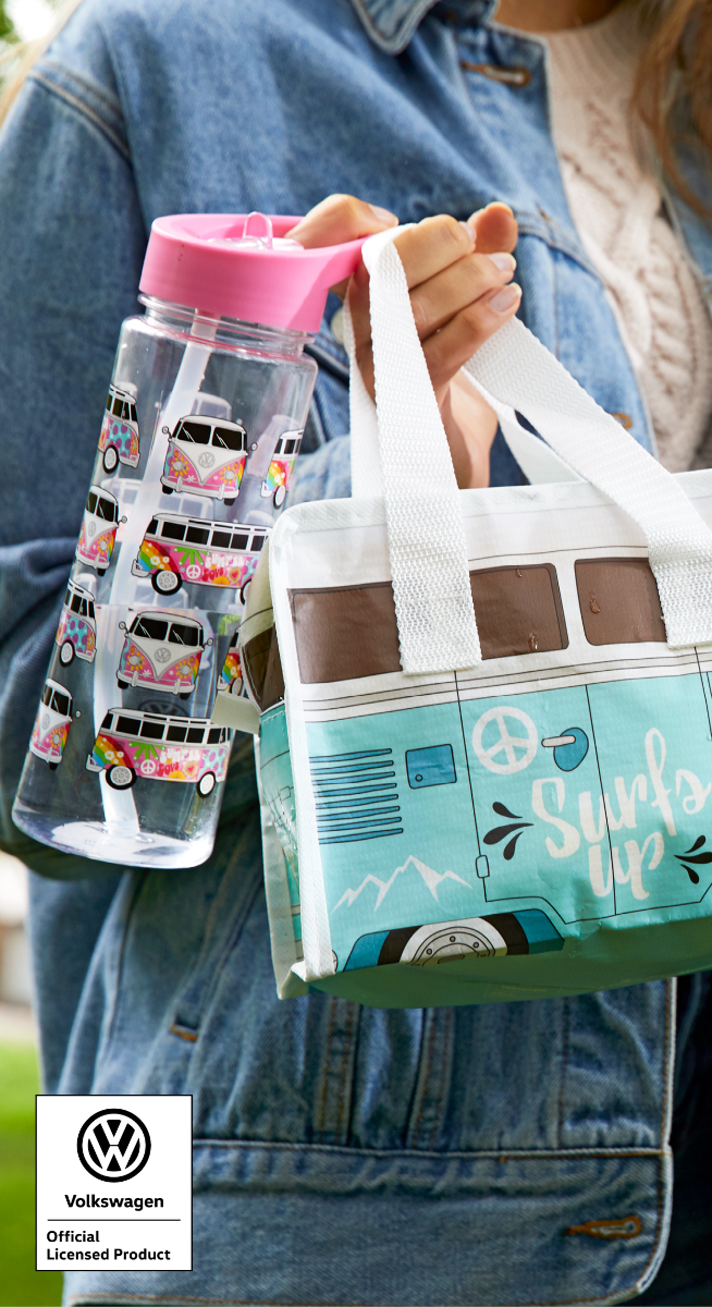 Our design team has also worked with Volkswagen to create exclusive designs based on the unmistakeable lines and curves of the iconic T1 camper. You'll find these on our zip purses, water bottles, travel cups, trays and drawstring bags, and even on a pet food bowl – and they're sure to draw the eye.