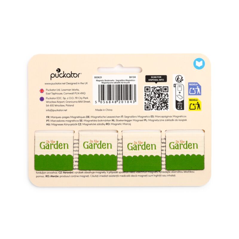 https://www.puckator.co.uk/book29-in-the-garden-magnetic-bookmark-set.htmlBOOK29In the Garden Magnetic Bookmark Set<p>In the Garden Magnetic Bookmark Set</p><ul><li><strong>Material:</strong> Metal Magnet, Paper</li></ul><p><strong>Product Resources:</strong></p><ul><li><strong>Want to find out more about purchasing from Puckator?</strong> Then read our <a href="/advice-centre" target="_blank" title="Puckator UK Customer Information Guide">customer information guide.</a></li><li><strong>Need more information on stationery sets?</strong> Visit our resource centre and browse our <a href="https://www.puckator.co.uk/stationery-guide" target=_blank" title="Puckator UK Stationery Product Guide with Novelty Pens, Pencils, Erasers & More">stationery sets product buying guide</a> full of useful tips and information on purchasing and selling our products.</li></ul>https://www.puckator.co.uk/media/catalog/product/B/O/BOOK29_001_1774624755.jpg0.85instock0.850.8500Puckator000https://www.puckator.co.uk/media/catalog/product/B/O/BOOK29_001_1774624755.jpg195221952019519/School & Office Stationery Accessories/Back in stock2025-10-27T09:54:10+0000No