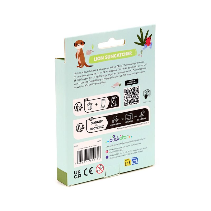 https://www.puckator.co.uk/diy01-zooniverse-lion-paint-your-own-diy-suncatcher.htmlDIY01Zooniverse Lion Paint Your Own DIY Suncatcher<p>Zooniverse Lion Paint Your Own DIY Suncatcher</p><ul><li><strong>Material:</strong> Polystyrene (Suncatcher), Paint (Pigment), Polypropylene (Brush), Polyester (String)</li><li><strong>Set Contains:</strong> Plastic suncatcher, string, paint brush & 3 paints.</li><li><strong>CE/UKCA Marked:</strong> Yes</li><li><strong>Not Suitable For:</strong> 0 - 3 Years</li><li><strong>EN71:</strong> Yes</li><li><strong>Product Information:</strong> Each suncatcher comes complete with instructions on how to complete. Once painted let dry completely before adding the string and hanging up. Adult supervision is recommended. Wash paint from surfaces immediately to avoid staining or damage.</li></ul><p><strong>Product Resources:</strong></p><ul><li><strong>Want to find out more about purchasing from Puckator?</strong> Then read our <a href="/advice-centre" target="_blank" title="Puckator UK Customer Information Guide">customer information guide.</a></li><li><strong>Need more information on novelty toys?</strong> Visit our resource centre and browse our <a href="https://www.puckator.co.uk/toys-guide" target=_blank" title="Puckator UK Novelty Toys Product Buying Guide">novelty toys product buying guide</a> full of useful tips and information on purchasing and selling our products.</li></ul>https://www.puckator.co.uk/media/catalog/product/D/I/DIY01_001_1754906232.jpg1.27instock1.271.2700Puckator000https://www.puckator.co.uk/media/catalog/product/D/I/DIY01_001_1754906232.jpg/Zoo, Safari & Wildlife Parks/Zooniverse/Creative Craft Kits & Educational Toys2024-12-24T06:46:46+0000No