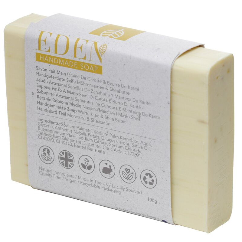 https://www.puckator.co.uk/esoap09-eden-handmade-soap-bar-carrot-seed-shea-butter.htmlESOAP09Eden Handmade Soap Bar Carrot Seed & Shea Butter<p>Eden Handmade Soap Bar Carrot Seed & Shea Butter</p><ul><li><strong>Material:</strong> Soap Base, Botanicals and Natural Oils</li><li><strong>Ingredients:</strong> Sodium Palmate, Sodium Palm Kernelate, Aqua, Glycerin, Anthemis Nobilis Petals, Daucus Carota, Sativa Oil, Butyropremum Parkii, Sodium Citrate, Sodium Chloride, Tetrasodium Glutamate Diacetate, Citric Acid, CI 77891, CI 42090, CI 19140, Benzyl Benzoate.</li><li><strong>Fragrance:</strong> Carrot Seed and Shea Butter</li><li><strong>Made in the UK:</strong> Yes</li><li><strong>Cruelty Free:</strong> Yes</li><li><strong>Vegan:</strong> Yes</li><li><strong>Gluten Free:</strong> Yes</li><li><strong>Palm Oil:</strong> Our soap bars do contain palm oil but only from sustainable sources.</li><li><strong>Product Information:</strong> Each bar weighs approximately 100g and comes with a card wrap around showing details of the ingredients and use by date.</li><li><strong>CPNP:</strong> UKCP-20887830/EU-3851928</li></ul><p><strong>Product Resources:</strong></p><ul><li><strong>Want to find out more about purchasing from Puckator?</strong> Then read our <a href="/advice-centre" target="_blank" title="Puckator UK Customer Information Guide">customer information guide.</a></li><li><strong>Need more information on soap?</strong> Visit our resource centre and browse our <a href="https://www.puckator.co.uk/soap-bath-bombs-guide" target=_blank" title="Puckator UK Bath Bombs and Soaps Product Buying Guide">soap product buying guide</a> full of useful tips and information on purchasing and selling our products.</li></ul><p><img src="{{media url="wysiwyg/Symbols/CRUELTYFREE.jpg";}}" alt="Cruelty Free Packaging Symbol|Puckator" width="100" height="100"><img src="{{media url="wysiwyg/Symbols/VEGAN.jpg";}}" alt="Vegan Packaging Symbol|Puckator" width="100" height="100"></p>https://www.puckator.co.uk/media/catalog/product/E/S/ESOAP09_001_1656688481.jpg1.95instock1.951.9500Puckator000https://www.puckator.co.uk/media/catalog/product/E/S/ESOAP09_001_1656688481.jpg11666116681166911673116811168311684116931169416324/Handmade Soap Loaves/Eden Collection2020-10-22T08:03:04+0000No