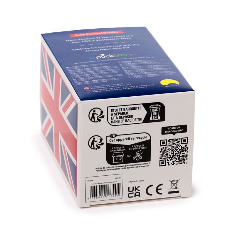 https://www.puckator.co.uk/ff104a-queen-elizabeth-solar-pal.htmlFF104AQueen Elizabeth Solar Pal<p>Queen Elizabeth Solar Pal</p><ul><li><strong>Material:</strong> Plastic (ABS), Metal (Magnet/Copper)</li><li><strong>CE/UKCA Marked:</strong> Yes</li><li><strong>Not Suitable For:</strong> 0 - 3 Years</li><li><strong>Safety Information:</strong> This is not a toy.</li></ul><p><strong>Product Resources:</strong></p><ul><li><strong>Want to find out more about purchasing from Puckator?</strong> Then read our <a href="/advice-centre" target="_blank" title="Puckator UK Customer Information Guide">customer information guide.</a></li><li><strong>Need more information on solar pals?</strong> Visit our resource centre and browse our <a href="https://www.puckator.co.uk/solar-pals-guide" target=_blank" title="Puckator UK Solar Pals Product Buying Guide">solar pals product buying guide</a> full of useful tips and information on purchasing and selling our products.</li><li><strong>Battery & Electrical Resources:</strong> Explore our comprehensive battery and electrical product resources, including essential safety guidelines and tips for responsible disposal. <a href="https://www.puckator.co.uk/battery-regulations-safe-disposal" " target=_blank" title="Battery & Electrical Regulations & Safety Information | Puckator"> Click here</a> to learn more.</li></ul>https://www.puckator.co.uk/media/catalog/product/F/F/FF104A_001_1733226558.jpg2.75instock2.752.7500Puckator000https://www.puckator.co.uk/media/catalog/product/F/F/FF104A_001_1733226558.jpg15801164621666517424181501826718268/London & UK Souvenirs/Solar Pals/Presidents & Leaders/Royal Family Novelty Memorabilia/British & London Souvenir Gifts2021-11-15T12:50:58+0000No