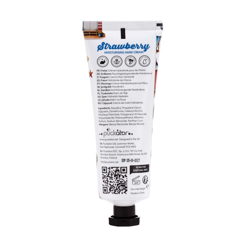 https://www.puckator.co.uk/handc16-coastal-moisturising-hand-cream-75ml.htmlHANDC16Coastal Moisturising Hand Cream 75ml<p>Coastal Moisturising Hand Cream 75ml</p><ul><li><strong>Material:</strong> Polyethylene and Aluminium (Tube), Polypropylene (Lid) and Hand Cream</li><li><strong>Fragrances:</strong> Strawberry and Vanilla</li><li><strong>Ingredients:</strong> Full ingredients can be found on the product packaging.</li><li><strong>Vegan:</strong> Yes</li><li><strong>Palm Oil Free:</strong> Yes</li><li><strong>Cruelty Free:</strong> Yes</li><li><strong>CPNP:</strong> TBC</li></ul><p><strong>Product Resources:</strong></p><ul><li><strong>Want to find out more about purchasing from Puckator?</strong> Then read our <a href="/advice-centre" target="_blank" title="Puckator UK Customer Information Guide">customer information guide.</a></li><li><strong>Need more information on beauty accessories?</strong> Visit our resource centre and browse our <a href="https://www.puckator.co.uk/beauty-accessories-buying-guide" target=_blank" title="Puckator UK Beauty Accessories Buying Guide">beauty accessories product buying guide</a> full of useful tips and information on purchasing and selling our products.</li></ul><p><img src="{{media url="wysiwyg/Symbols/CRUELTYFREE.jpg";}}" alt="Cruelty Free Packaging Symbol|Puckator" width="100" height="100"><img src="{{media url="wysiwyg/Symbols/PALMOILFREE.jpg";}}" alt="Palm Oil Free Packaging Symbol|Puckator" width="100" height="100"><img src="{{media url="wysiwyg/Symbols/VEGAN.jpg";}}" alt="Vegan Packaging Symbol|Puckator" width="100" height="100"></p>https://www.puckator.co.uk/media/catalog/product/H/A/HANDC16_001_1741968417.jpg1.49instock1.491.4900Puckator000https://www.puckator.co.uk/media/catalog/product/H/A/HANDC16_001_1741968417.jpg188761938918878/Lip Balm & Lip Gloss/Seaside & Beach Gifts/Hand Cream2024-11-01T14:16:51+0000No