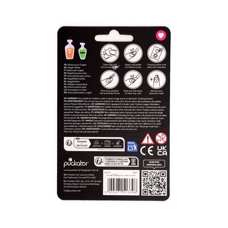 https://www.puckator.co.uk/nail167-spooky-self-adhesive-nail-stickers.htmlNAIL167Spooky Self Adhesive Nail Stickers<p>Spooky Self Adhesive Nail Stickers</p><ul><li><strong>Material:</strong> Plastic</li><li><strong>Seasonal Holiday / Festive Occasion: </strong>Halloween</li></ul><p><strong>Product Resources:</strong></p><ul><li><strong>Want to find out more about purchasing from Puckator?</strong> Then read our <a href="/advice-centre" target="_blank" title="Puckator UK Customer Information Guide">customer information guide.</a></li><li><strong>Need more information on nail files and accessories?</strong> Visit our resource centre and browse our <a href="https://www.puckator.co.uk/nail-accessories-guide" target=_blank" title="Puckator UK Nail Accessories Product Buying Guide">nail files and accessories product buying guide</a> full of useful tips and information on purchasing and selling our products.</li></ul>https://www.puckator.co.uk/media/catalog/product/N/A/NAIL167_001_1760013025.jpg0.5instock0.50.500Puckator000https://www.puckator.co.uk/media/catalog/product/N/A/NAIL167_001_1760013025.jpg16699192881895418953/Nail Accessories/Halloween Gifts & Decorations2025-02-14T06:51:11+0000No