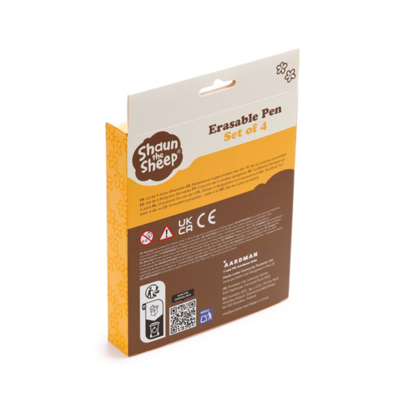 https://www.puckator.co.uk/pen270-set-of-4-kawaii-cute-shaun-the-sheep-erasable-pens-with-pvc-topper.htmlPEN270Set of 4 Kawaii Cute Shaun the Sheep Erasable Pens with PVC Topper<p>Set of 4 Kawaii Cute Shaun the Sheep Erasable Pens with PVC Topper</p><ul><li><strong>Material: </strong>Plastic (ABS/TPR), PVC, Silicone and Stainless Steel</li><li><strong>Number in Set: </strong>4</li><li><strong>Ink Colour: </strong>Blue</li><li><strong>CE/UKCA Marked: </strong>Yes</li><li><strong>EN71: </strong>Yes</li><li><strong>Not Suitable For: </strong>0 - 3 Years</li><li><strong>Product Information: </strong>Click the PVC charm to use the pen. Erase what you have written using the rubber tip on the top of the pen.</li><li><strong>License Information:</strong> This product is fully licensed and can be sold worldwide.</li></ul><p><strong>Product Resources:</strong></p><ul><li><strong>Want to find out more about purchasing from Puckator?</strong> Then read our <a href="/advice-centre" target="_blank" title="Puckator UK Customer Information Guide">customer information guide.</a></li><li><strong>Need more information on novelty pens?</strong> Visit our resource centre and browse our <a href="https://www.puckator.co.uk/stationery-guide" target=_blank" title="Puckator UK Stationery Product Guide with Novelty Pens, Pencils, Erasers & More">novelty pens product buying guide</a> full of useful tips and information on purchasing and selling our products.</li></ul><p><img src="{{media url="wysiwyg/Symbols/ERASABLE.jpg";}}" alt="Erasable Packaging Symbol|Puckator" width="100" height="100"></p>https://www.puckator.co.uk/media/catalog/product/P/E/PEN270_001_1774963408.jpg2.25instock2.252.2500Puckator000https://www.puckator.co.uk/media/catalog/product/P/E/PEN270_001_1774963408.jpg175511915819193194581945919460195541957919580/Novelty Pens/Farm Park Wholesale Gifts/Shaun the Sheep and Wallace & Gromit/Back in stock EU/New EU/New/Back in stock2025-10-27T09:54:27+0000Yes