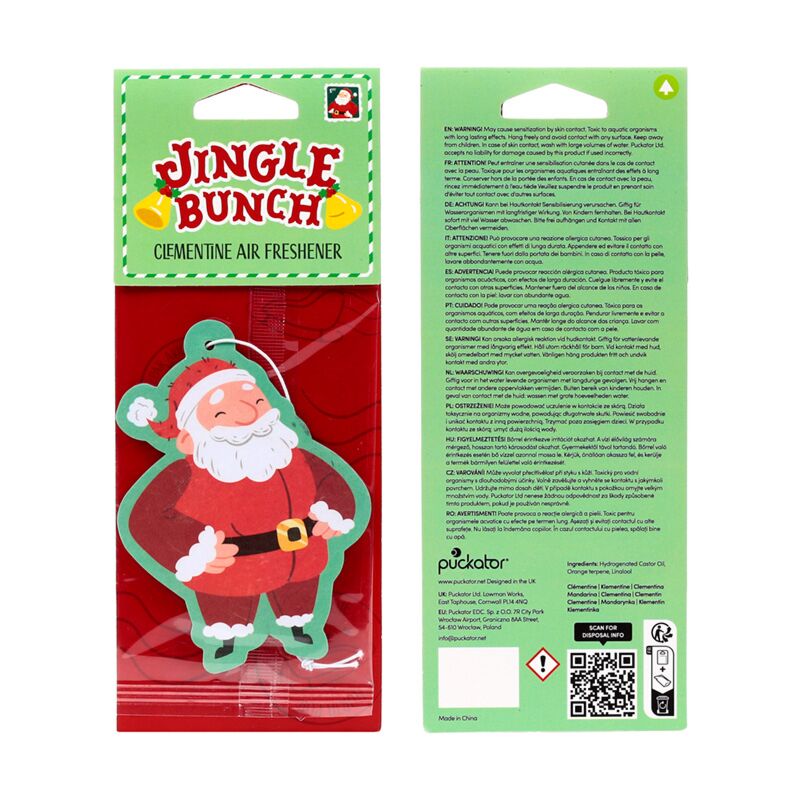 https://www.puckator.co.uk/xairf171-clementine-jingle-bunch-christmas-santa-air-freshener.htmlXAIRF171Clementine Jingle Bunch Christmas Santa Air Freshener<p>Clementine Jingle Bunch Christmas Santa Air Freshener</p><ul><li><strong>Material:</strong> Card, Polypropylene, Elastic, Absorbant Paper, and Fragrance</li><li><strong>Fragrance:</strong> Clementine</li><li><strong>Safety Information:</strong> Keep away from children. Full safety and fragrance information is shown on the product packaging. Do not rest or lean against any surface as the oils in the air freshener can cause staining or damage.</li><li><strong>Seasonal Holiday / Festive Occasion: </strong>Christmas</li></ul><p><strong>Product Resources:</strong></p><ul><li><strong>Want to find out more about purchasing from Puckator?</strong> Then read our <a href="/advice-centre" target="_blank" title="Puckator UK Customer Information Guide">customer information guide.</a></li><li><strong>Need more information on air fresheners?</strong> Visit our resource centre and browse our <a href="https://www.puckator.co.uk/air-fresheners-guide" target=_blank" title="Hints and Tips Guide to Buying and Selling Air Fresheners from Puckator UK"> hints and tips guide</a> to buying and selling air fresheners.</li></ul>https://www.puckator.co.uk/media/catalog/product/X/A/XAIRF171_001_1759394352.jpg0.46outofstock0.460.4600Puckator000https://www.puckator.co.uk/media/catalog/product/X/A/XAIRF171_001_1759394352.jpg158761660117193178081812618127194091941019411/Car Air Fresheners/Christmas Gifts & Decorations/Christmas Beauty & Fragrance2025-02-14T06:50:23+0000No